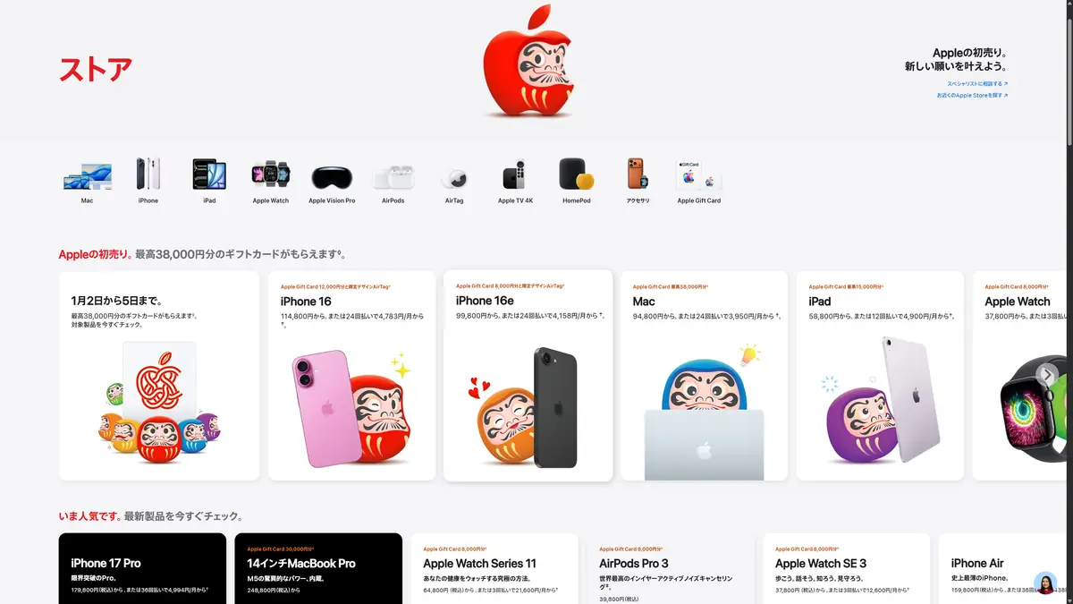 2026年1月2日~1月5日まで、Apple公式HPで「Appleの初売り」が開催中。