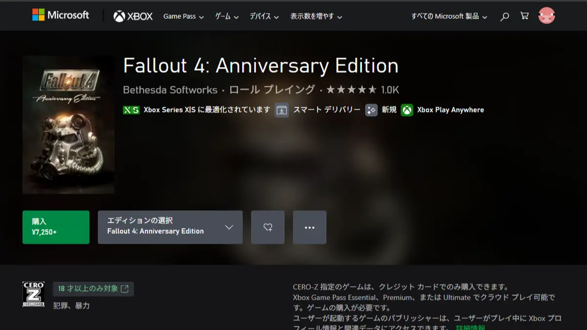 「Fallout 4 Anniversary Edition」のPC版は、SteamとMicrosoft Storeで購入可能になっており、価格は7,250円(税込)。