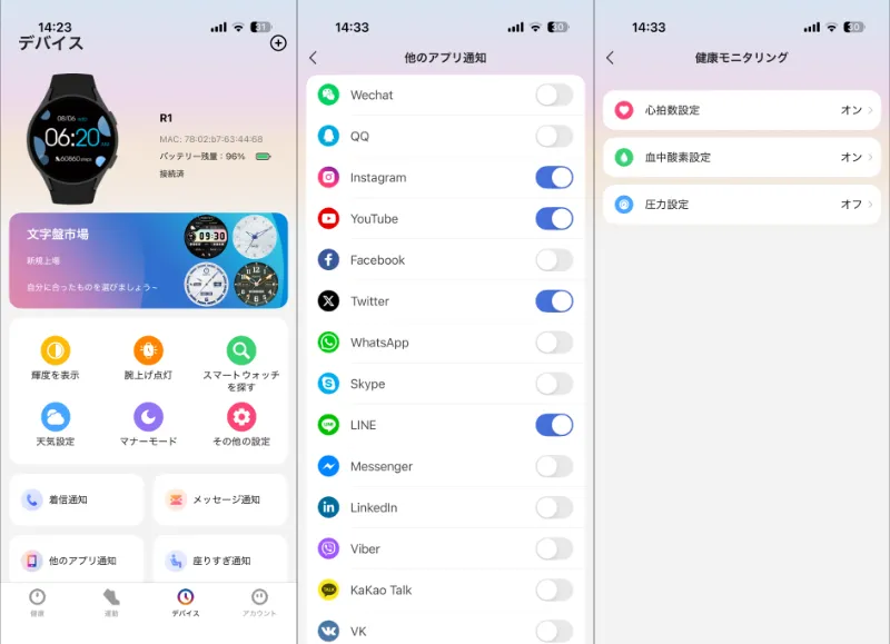 FOSMET R1は、LINE、Twitter、Instagram、Facebook、Gmailなどの主要アプリの通知に対応しているほか、通話時の音声品質は比較的クリアで実用的。