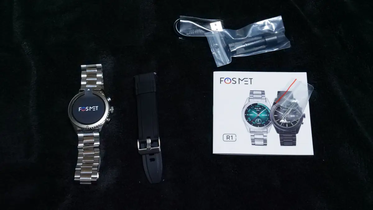 付属品は、FOSMET R1本体(メタルバンド装着済み)、シリコンバンド、充電ケーブル、日本語説明書、交換用ピンが2つ、メタルバンドの長さ調整ツール。