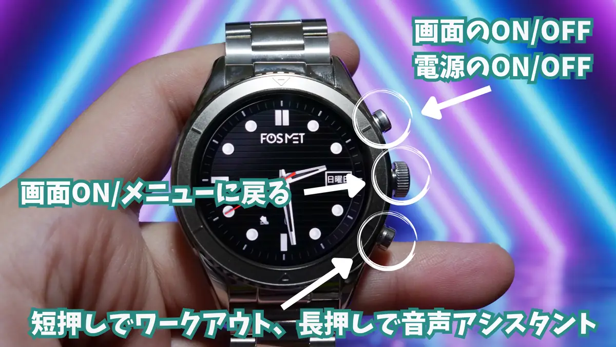 | 下のボタン | 短押し:ワークアウト起動 長押し:音声アシスタント起動 ※本体の設定からカスタム可能 |
