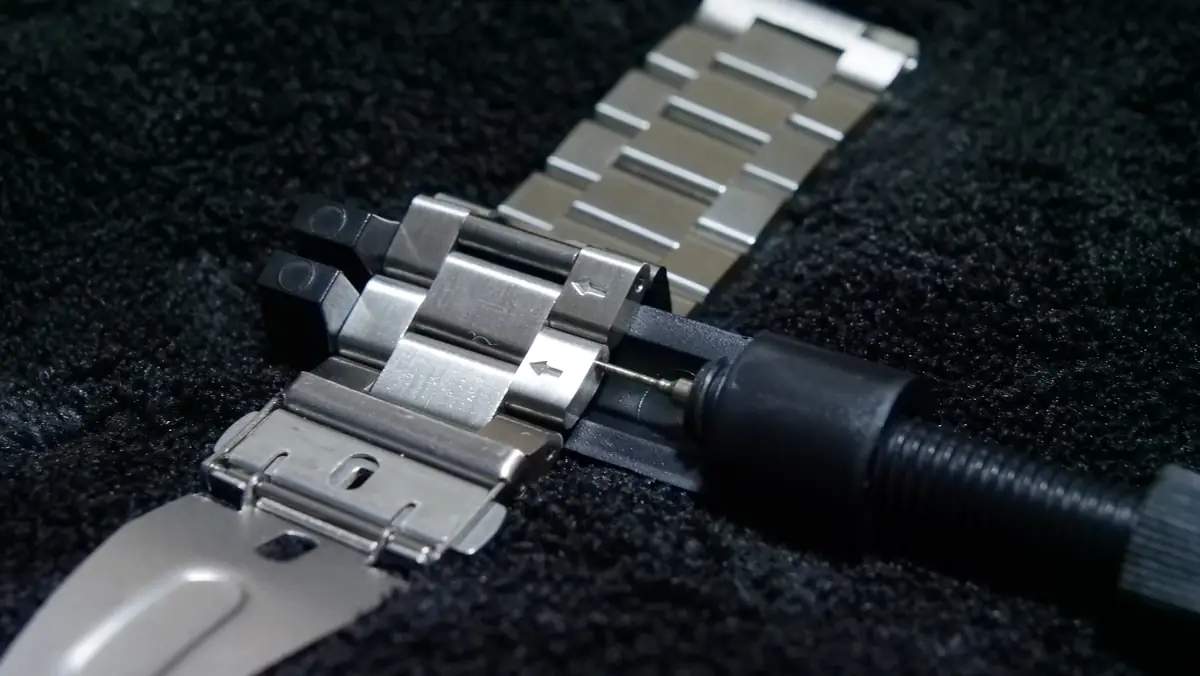 ツールのネジを回していくと、メタルバンドのピンが出てくるので、抜く。