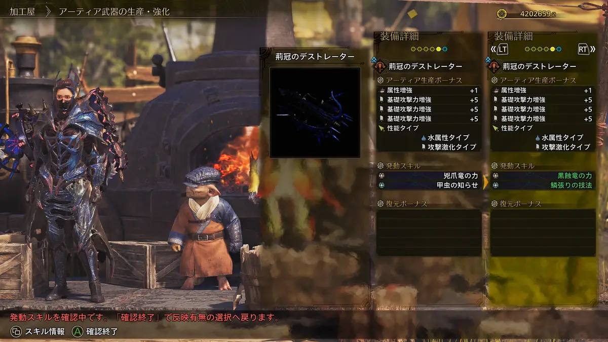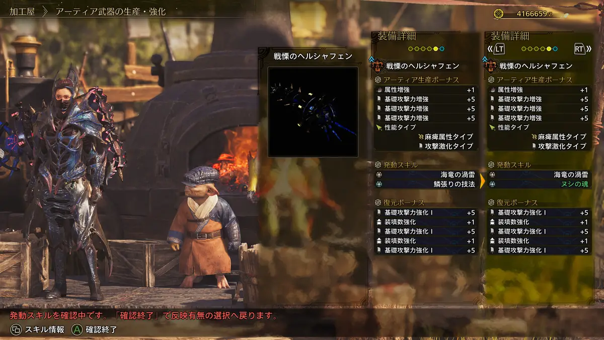 巨戟アーティア武器に付与できるシリーズスキルとグループスキルは、専用素材を使用して再抽選できるので、ヌシの魂も狙えます。
