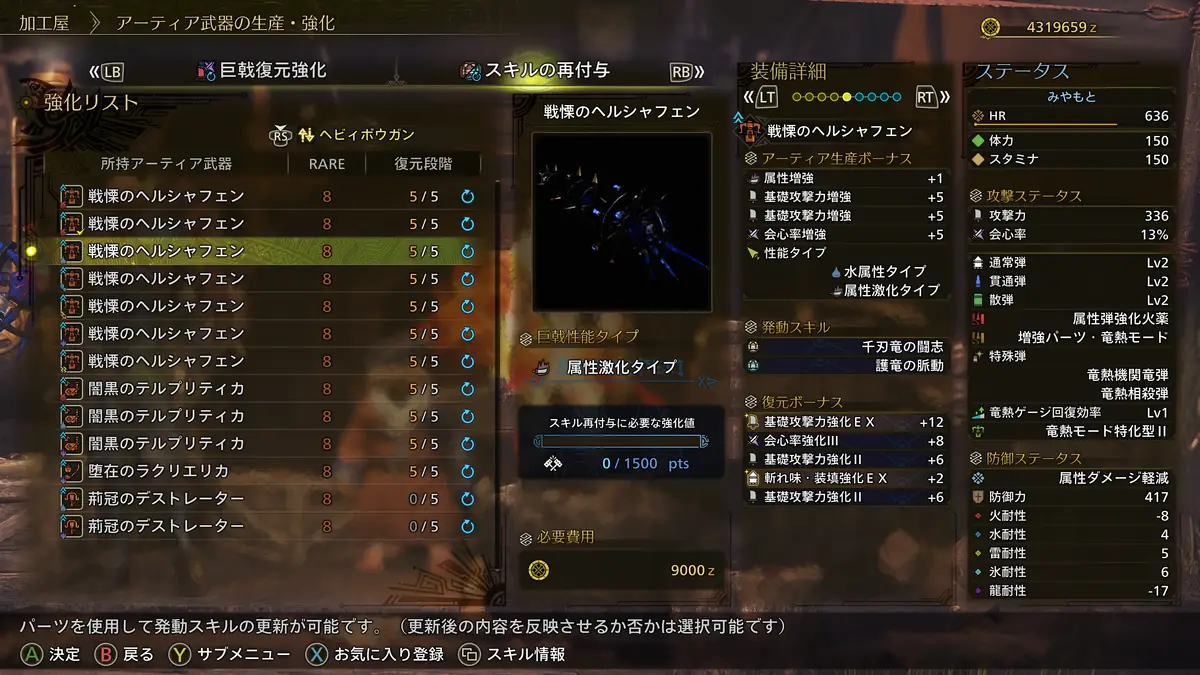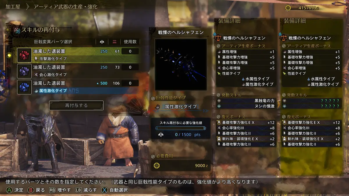 - 巨戟アーティア武器で目当てのスキルを引くまで、ひたすらスキルを変更する