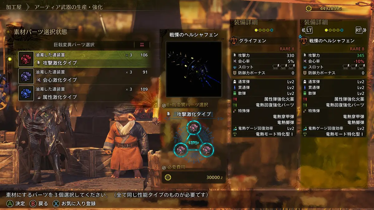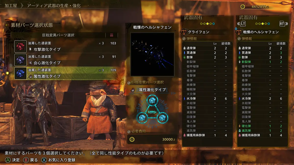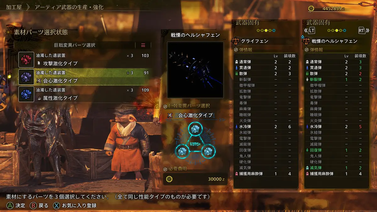理想の復元強化は上記の通り。グライフェンでよく使う「属性弾」は装填数が多いため、「基礎攻撃力強化×3、装填数強化×2」よりも、「基礎攻撃力強化×4、装填数強化×1」のほうがトータルDPSが”ほんの僅かに”高くなりますが、やっぱり装填数が多いほうが圧倒的に使いやすいので...僕のおすすめは装填数強化×2。