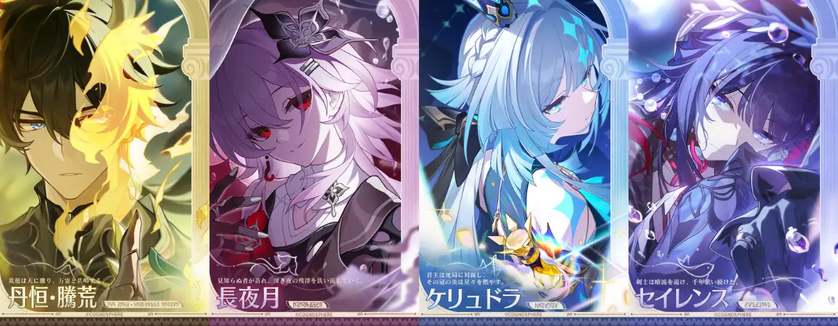 公式Xで配布された丹恒・騰荒、長夜付き、ケリュドラ、セイレンスのイラスト。縦長比率になっているので、スマホ用の壁紙にいいかも。