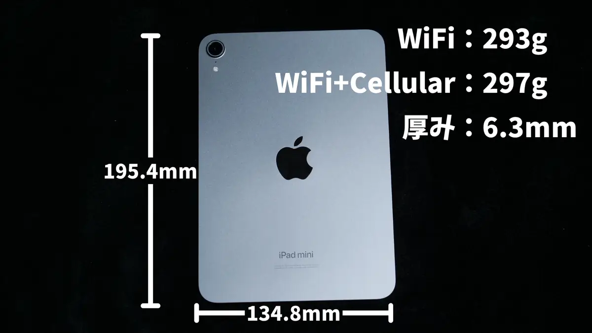 画面:8.3インチ Liquid Retina|チップ:A17 Pro(6コアCPU/5コアGPU)|リアカメラ:12MPセンターフレーム対応|Wi-Fi 6E|5G(sub-6)|Touch-ID(指紋認証)|電池持ち:最大10時間