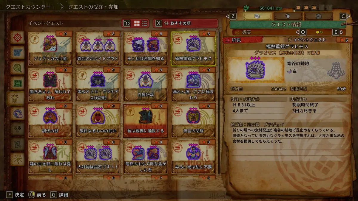 周回におすすめなイベクエの筆頭「極熱重鎧グラビモス」は、食材のほか、よりどり高級お食事券を入手できるイベクエ。