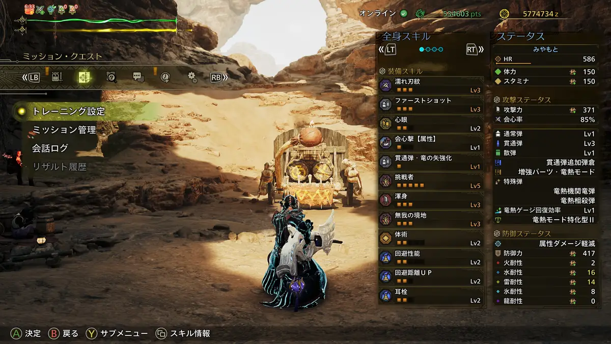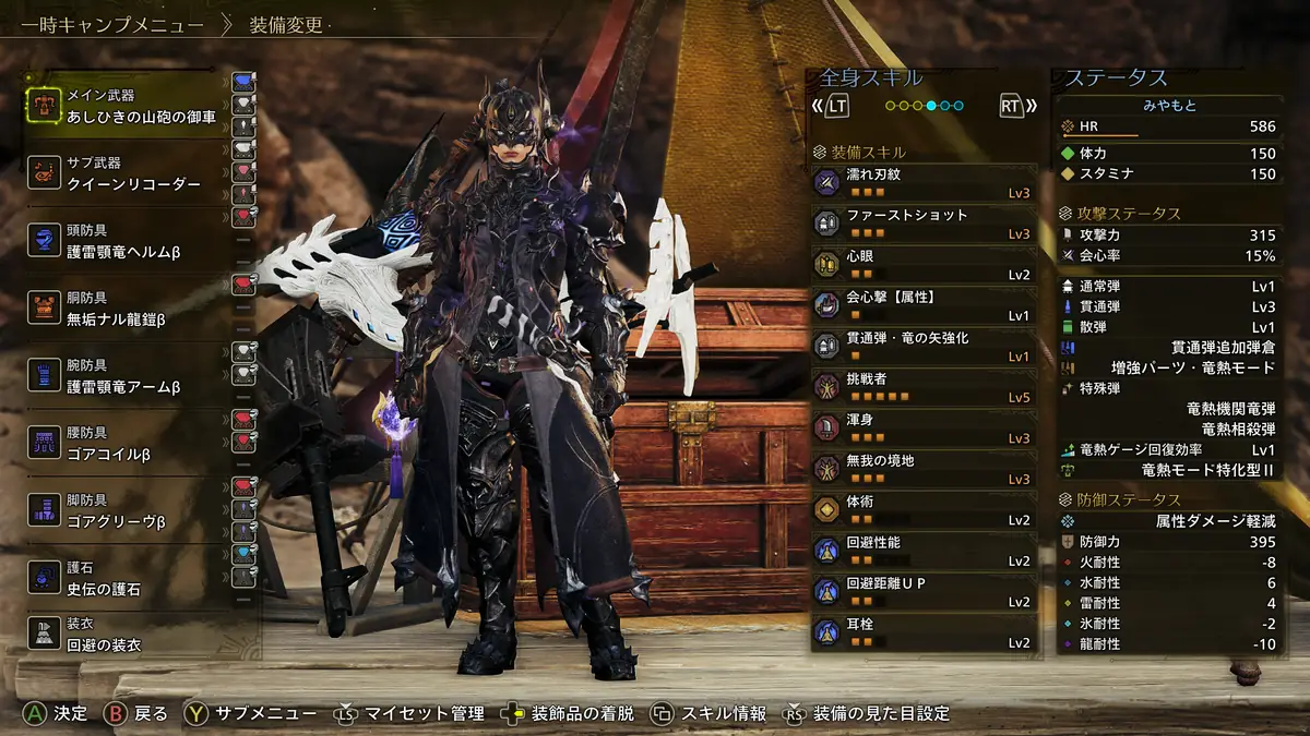 火力と快適性、扱いやすさを両立したビルドになっており、会心率はやや控えめですが、挑戦者に弱点特攻、超会心、貫通弾強化、回避性能に回避距離UPとなかなかに良い感じのスキルが発動しているため、かなり扱いやすいかなと。