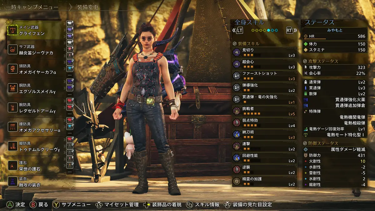 | メイン武器 | グライフェン | 初弾・射法珠【3】 超心珠Ⅲ【3】 達人珠Ⅲ【3】 |