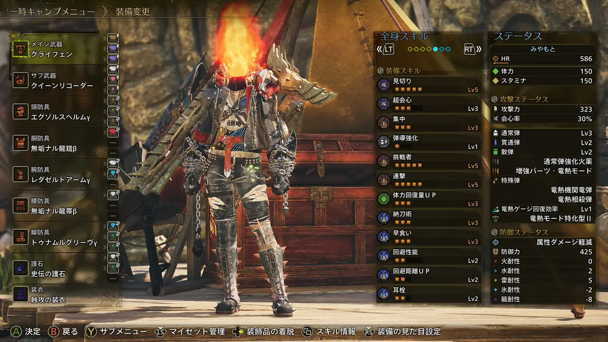 根性【果敢】と超回復力Ⅰ、回避距離、回避距離UP、早食いなどの生存&便利スキルを搭載しつつ、見切りと超会心、挑戦者や連撃で高い火力を叩き出せる機関竜弾特化ヘビィ装備です。