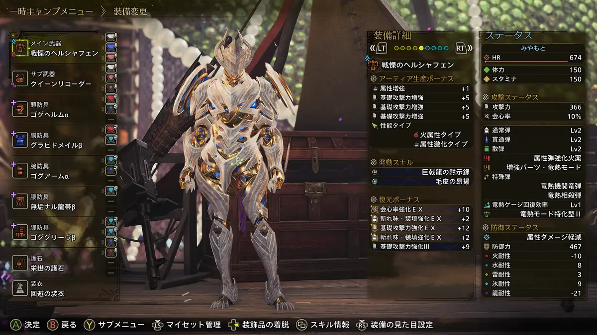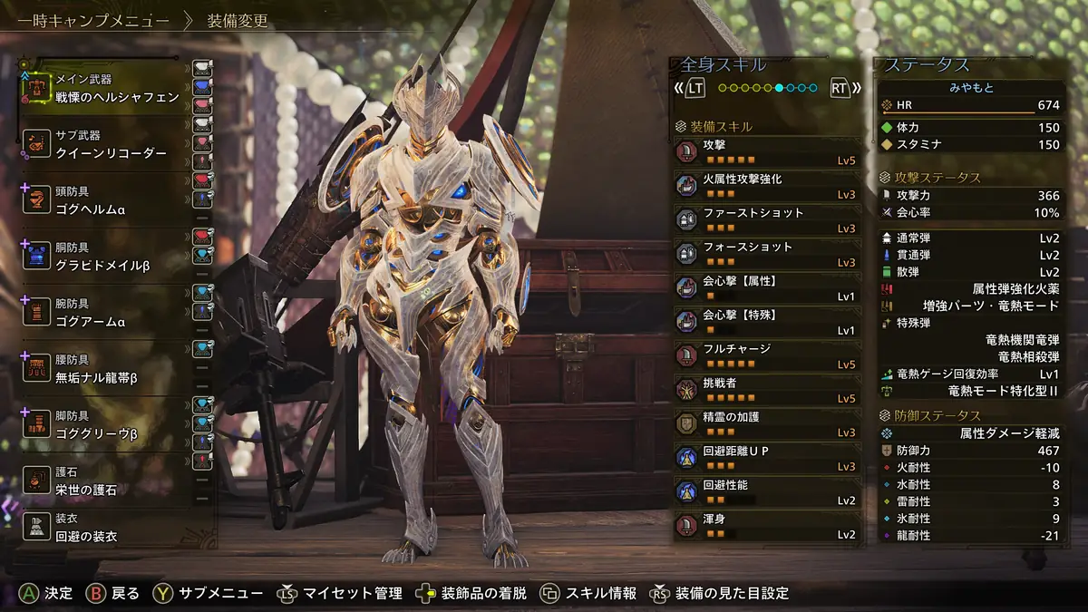 宣戦呼応Ⅱのバリアは蝕攻の装衣のダメージも防げますが、今回の装備構成だとフルチャージ Lv5を採用しているため相性は悪い。火力を高めるなら回避の装衣。安定感を重視するなら不動の装衣や再生の装衣がおすすめです。