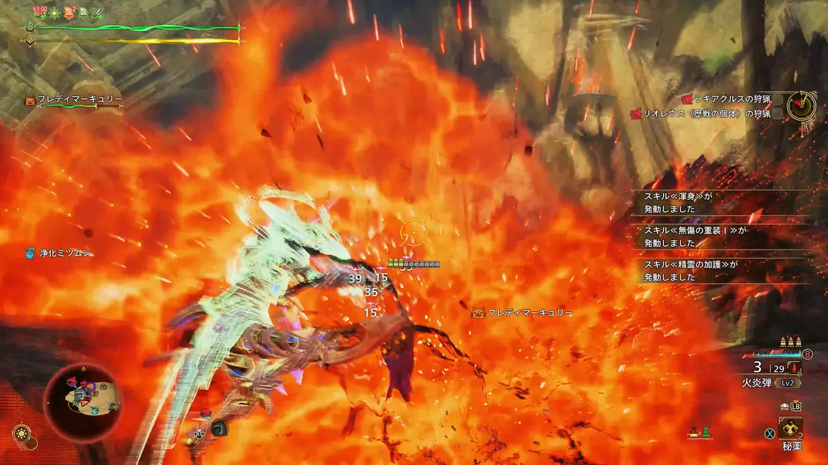 どうせなら”宣戦呼応Ⅱの属性攻撃強化効果”を活かしたいし...ってことで、武器は火属性を採用していますが、このあたりはお好みで。挑戦者 Lv5、フルチャージ Lv5、連撃 Lv1のおかげで、火力もかなり高めの装備構成になっています。