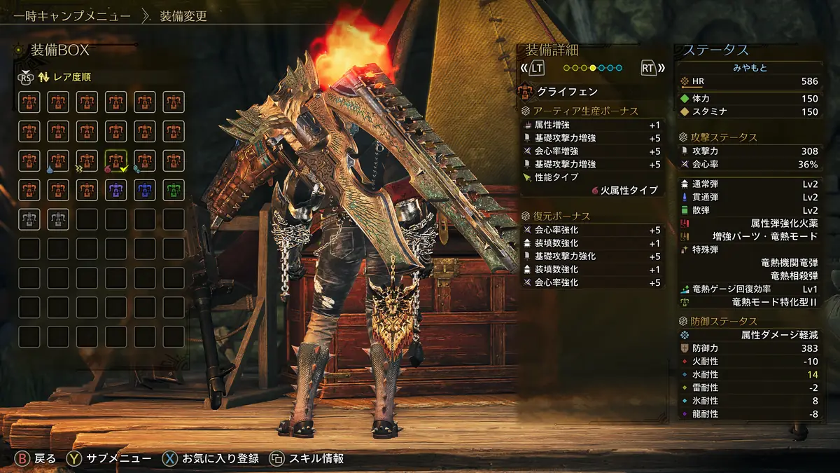 現環境で属性ヘビィの最強装備は、アーティア武器「グライフェン」を担いで属性強化スキルに特化した装備。