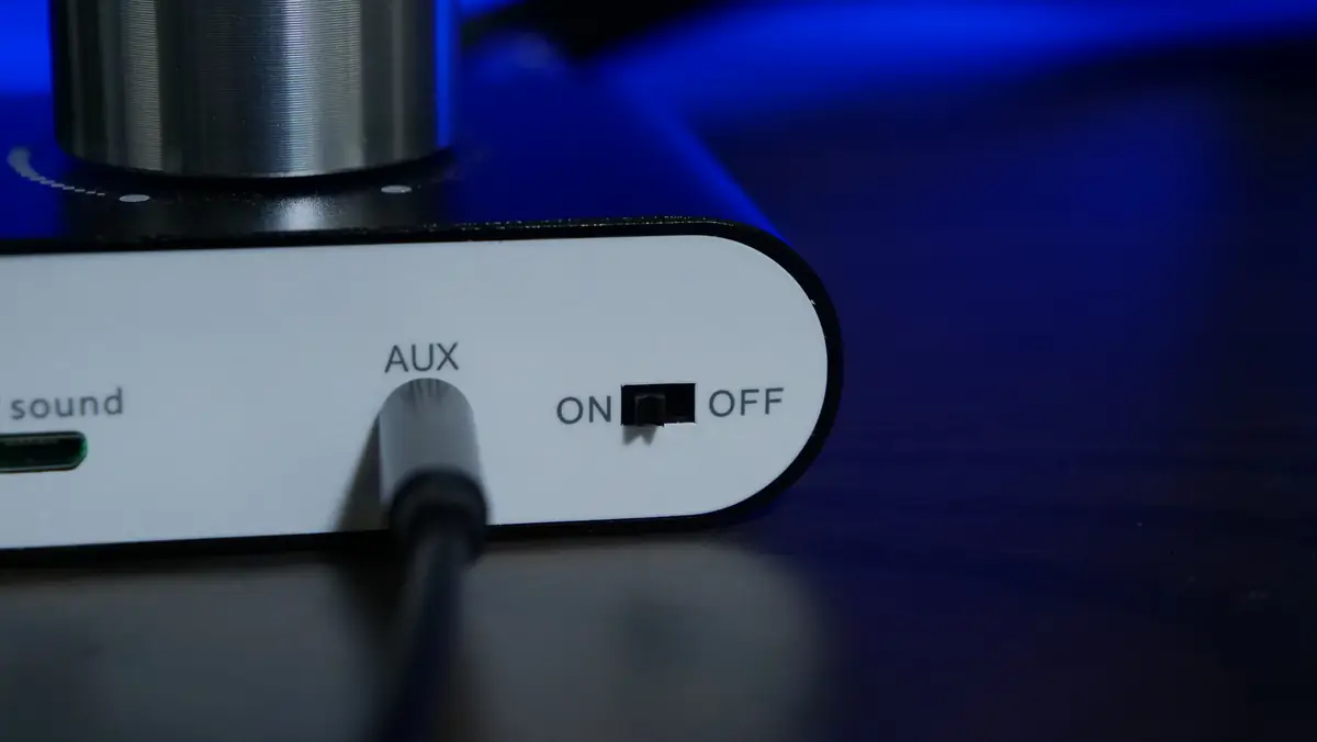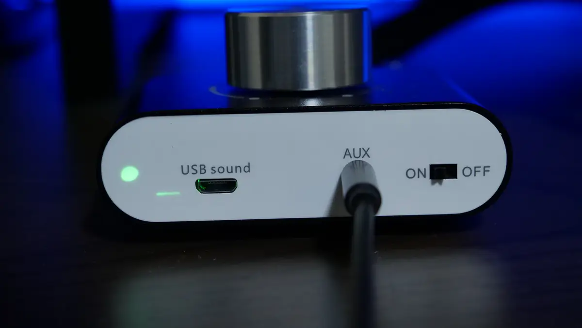 背面にはスピーカーの接続端子と電源アダプタ用端子のみ。前面にはUSB端子とAUX端子、電源スイッチのみ。上面には音量調整が可能な大きめのノブが搭載されています。