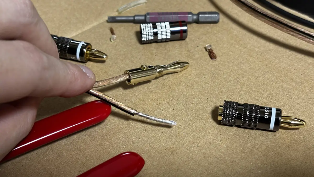 バナナプラグの取り付けは簡単で、スピーカーケーブルの被覆を1cmほど剥し、剥き出しの芯線を撚った後、バナナプラグを取り付けましょう。バナナプラグのイモネジを締めれば簡単に固定できます。