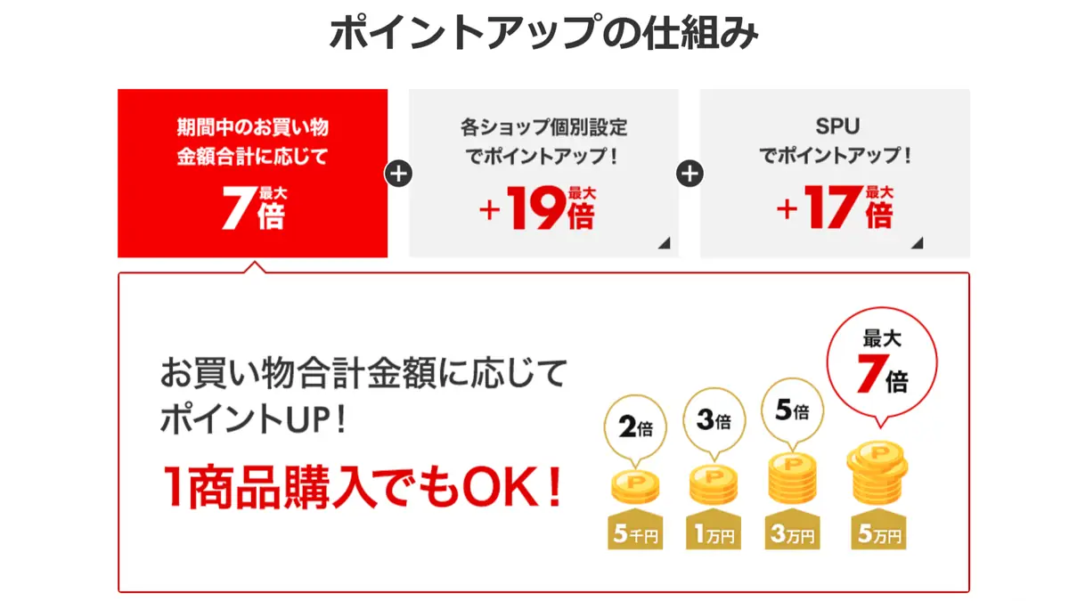 新春ポイントアップ祭では、期間中の合計購入金額に応じてポイントがアップし、例えば、5千円で2倍、1万円で3倍、3万円で5倍、5万円で7倍といった感じでもらえるポイントが上がります。