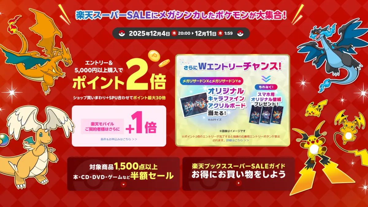 【楽天ブックス】楽天スーパーSALE にエントリーしたユーザーに、ポケモンデザインのスマホ用オリジナル壁紙(メガサーナイト、メガルカリオ、メガリザードンX)をダウンロードできるほか、楽天スーパーSALEと抽選のWエントリーで10名に 「オリジナルキャラファインアクリルボードA4 (メガリザードンX メガリザードンY)」 をプレゼントするキャンペーンも開催中です。