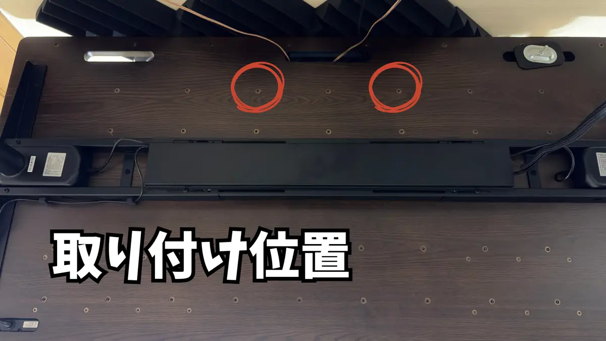 ケーブルトレイをデスクの中心に配置したい場合、ブラケットの取り付け位置は上画像の通りですが、同じ列のネジ穴なら、どこでも取り付け可能です。