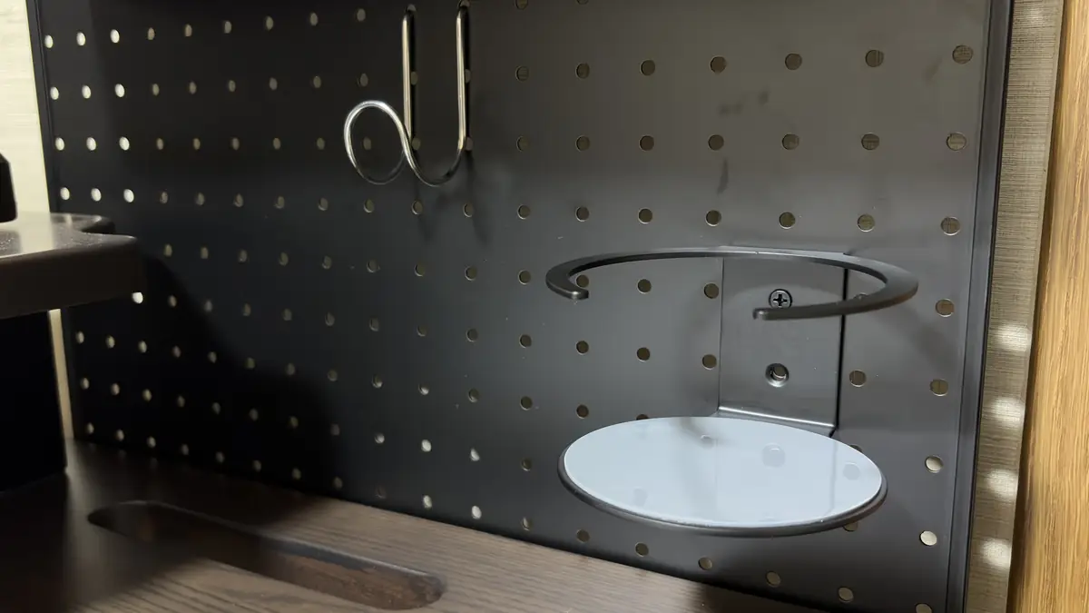 パンチングボードを固定したら、最後にトレーとフック、ペンスタンドを好みの場所に取り付けて組み立ては終わり。