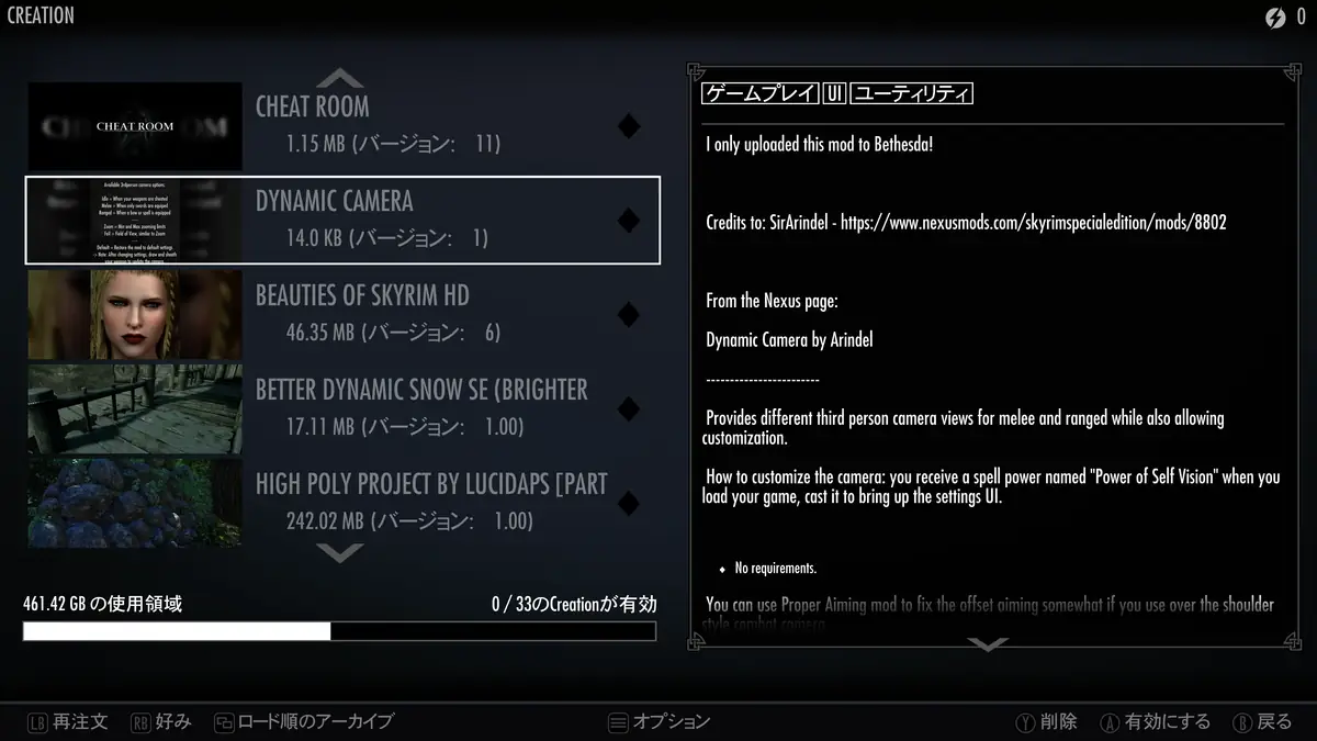※Creation ClubのMOD適用時と未適用時だと、未適用時のほうが遥かに安定します。クラッシュするのも稀。