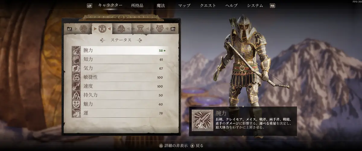 最終的にはすべてのステータスを上限まで振れるため、ゲームが進めば進むほどビルドの自由度があがります。