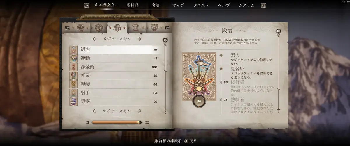 本作では、あらかじめ用意されたビルド(戦士や鍛冶師など)を選択するか、自分で成長しやすい”メジャースキル”を7つ選び、それ以外を”マイナースキル”として、キャラクターを育成していくのですが、メジャー/マイナー含めてスキルレベルが上がるとキャラクターのレベルが上がり、レベルアップ時に獲得できる”徳ポイント”でステ振りします。
