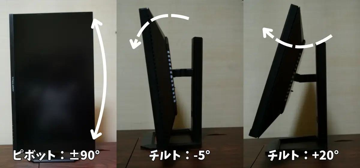 高さ調整、ピボット、チルト、スイーベル対応。付属スタンドの可動範囲について