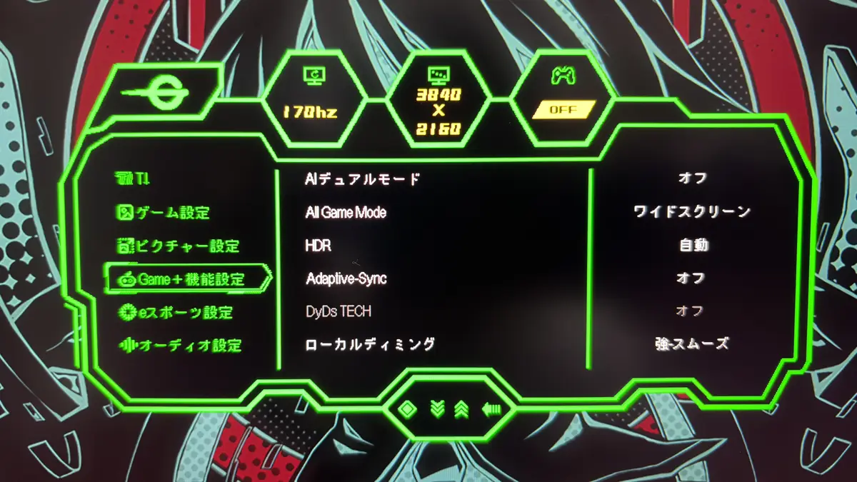 4K/170Hzだけでなく、デュアルモードによりFHD/340Hzでの超高リフレッシュレートにも対応していますが、デュアルモードの切り替えに10秒ほどかかり、その都度切り替えるのは煩わしいので、僕は一切使ってません。