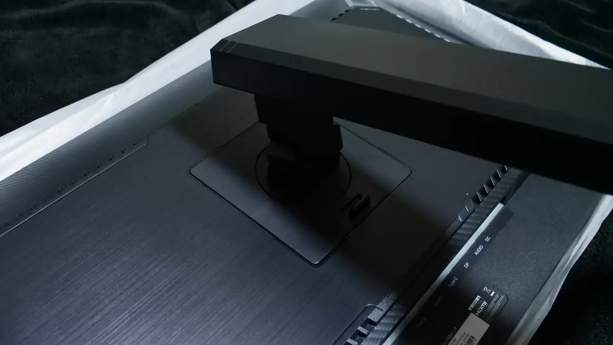 TITAN ARMY P275MV MAXの組み立ては、スタンドに”脚”を取り付け後、モニターの背面にカチャッと合体するだけなので、ものすごく簡単です。数分で終わる作業ですが、画面を傷つけないようにご注意を。