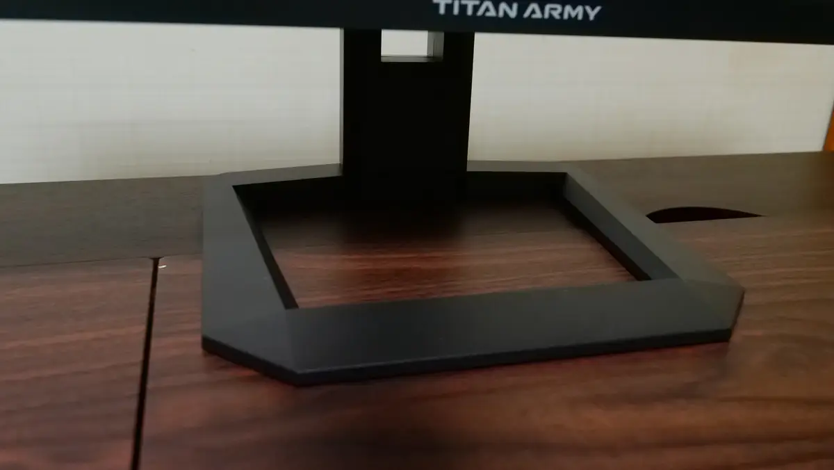 TITAN ARMYのロゴがちょっと主張しすぎ感はありますが、”チープさ”は全然なくて。付属スタンドは上下昇降、ピボット、チルト、スイーベルに対応するほか、100×100のVESAマウントにも対応するため、モニターアームと組み合わせることもできます。
